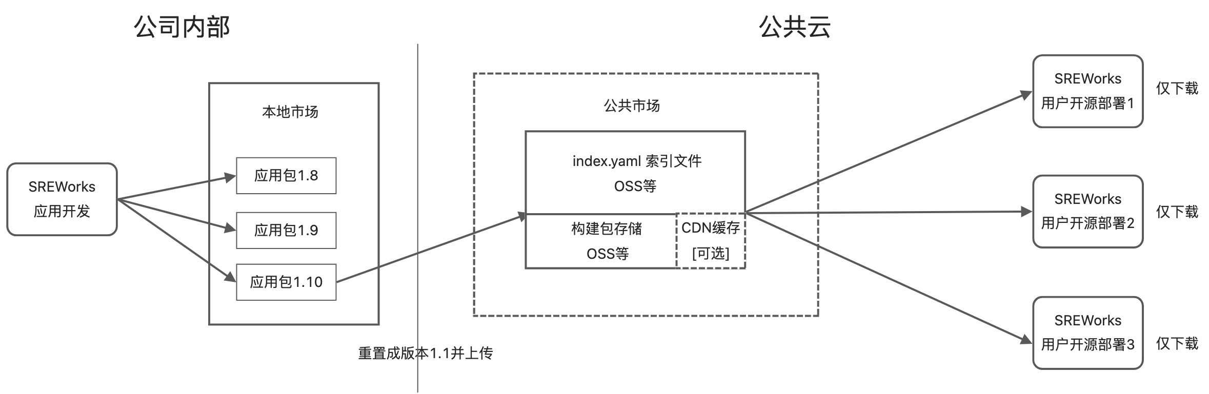 SREWorks团队参考helm/rpm等常见软件仓库模型,设计了SREWorks的市场分发机制如下图所示: