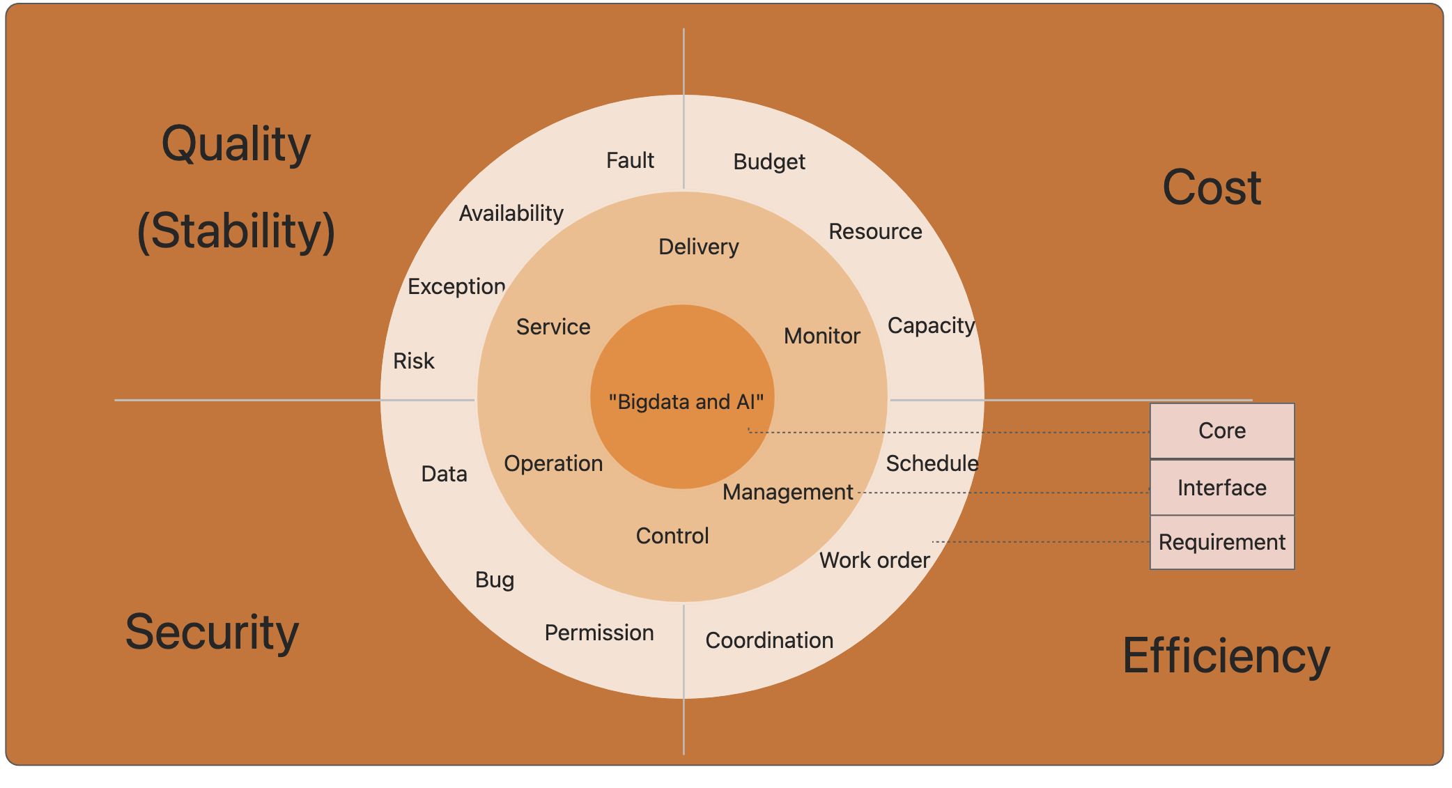 在不同的公司,或者是同一个公司里不同的发展阶段,运维所承担的职责都会有所不同,运维的价值也没有固定的公式去计算或衡量。但无论是职责多变,还是价值各异(体感高低),运维相关的内容边界或者是需求都可以划定在“质量、成本、效率、安全”的几个本质维度下,所有公司或阶段的运维工作无非都是解决上述四类领域场景需求。